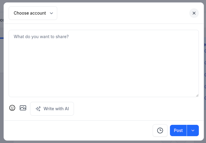 Once you are all set navigate to the content share menu and click on "Share a post" button, you should see a post form modal as seen below.